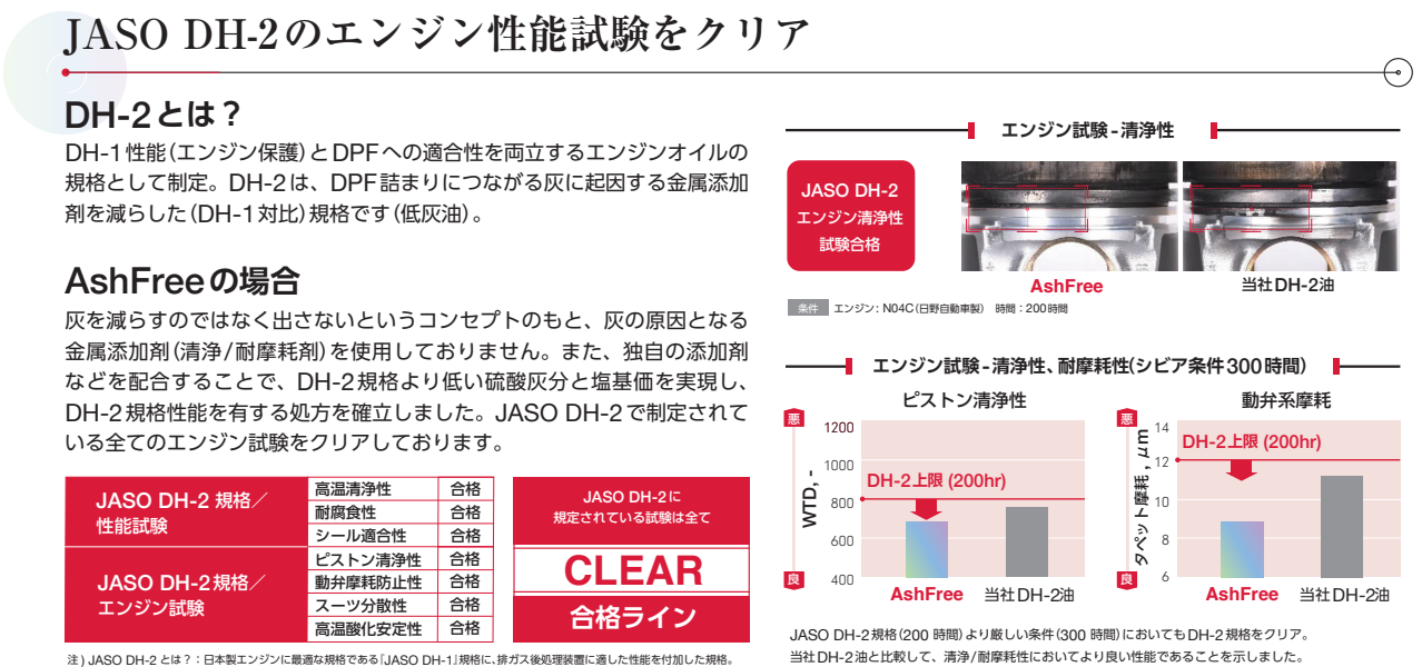 「idemitsu AshFree(イデミツ アッシュフリー)」はJASO DH-2で制定されている全てのエンジン試験をクリアしているだけでなく、JASO DH-2規格(200 時間)より厳しい条件(300 時間)においても試験をクリアしています。つまり、従来の出光DH-2油と比較して、清浄/耐摩耗性においてより良い性能ということが証明されていますが、実際にDH-2規格を取得している訳ではございませんのでご注意ください。