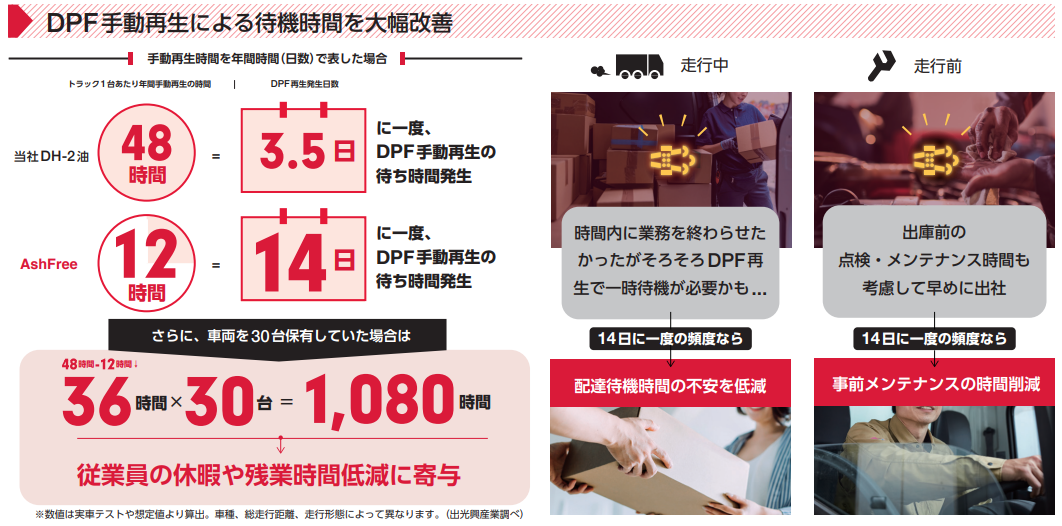 →古いDPFでも途中で「idemitsu AshFree(イデミツ アッシュフリー)」に切り替えることで、それ以上灰が溜まることを防ぐ効果があります。逆に新しい車両の場合、DPFに灰が溜まっていないため、すぐに効果は得られませんが、継続使用することでDPFトラブル低減になります。