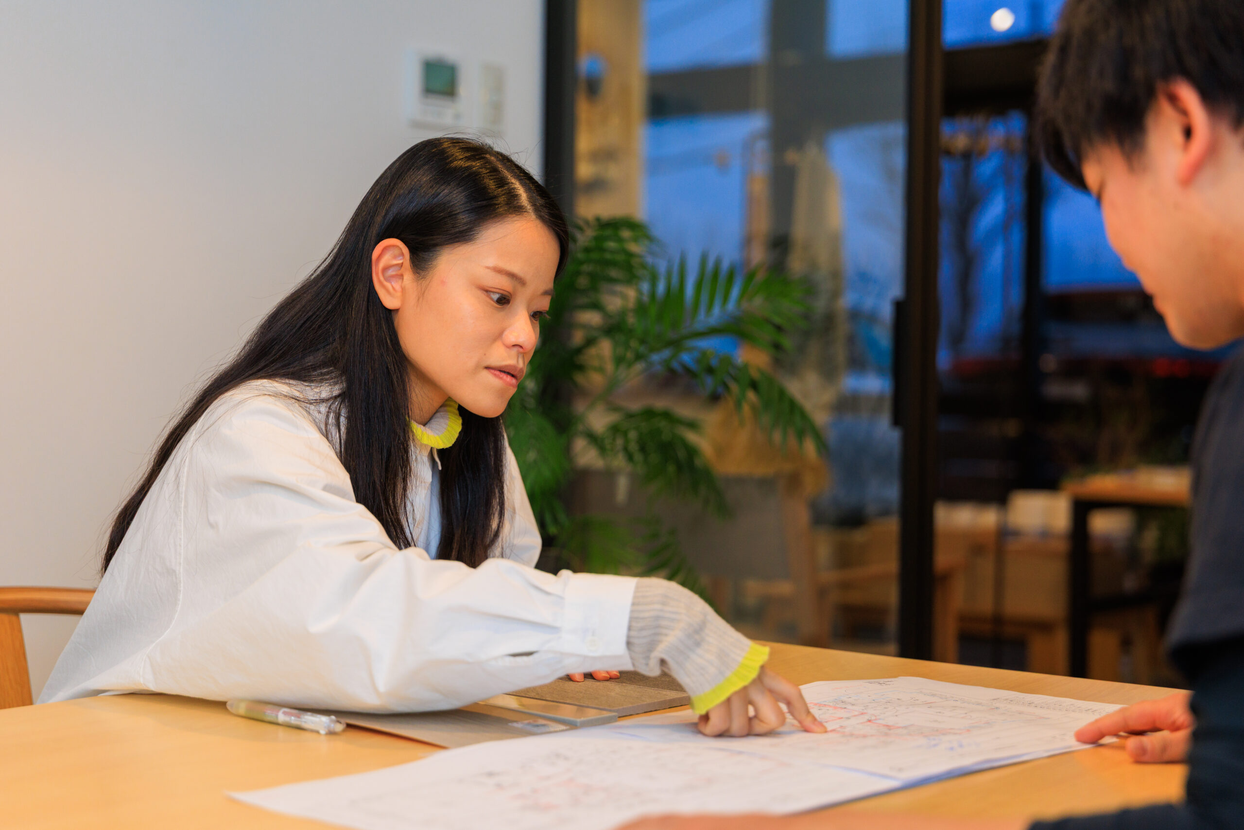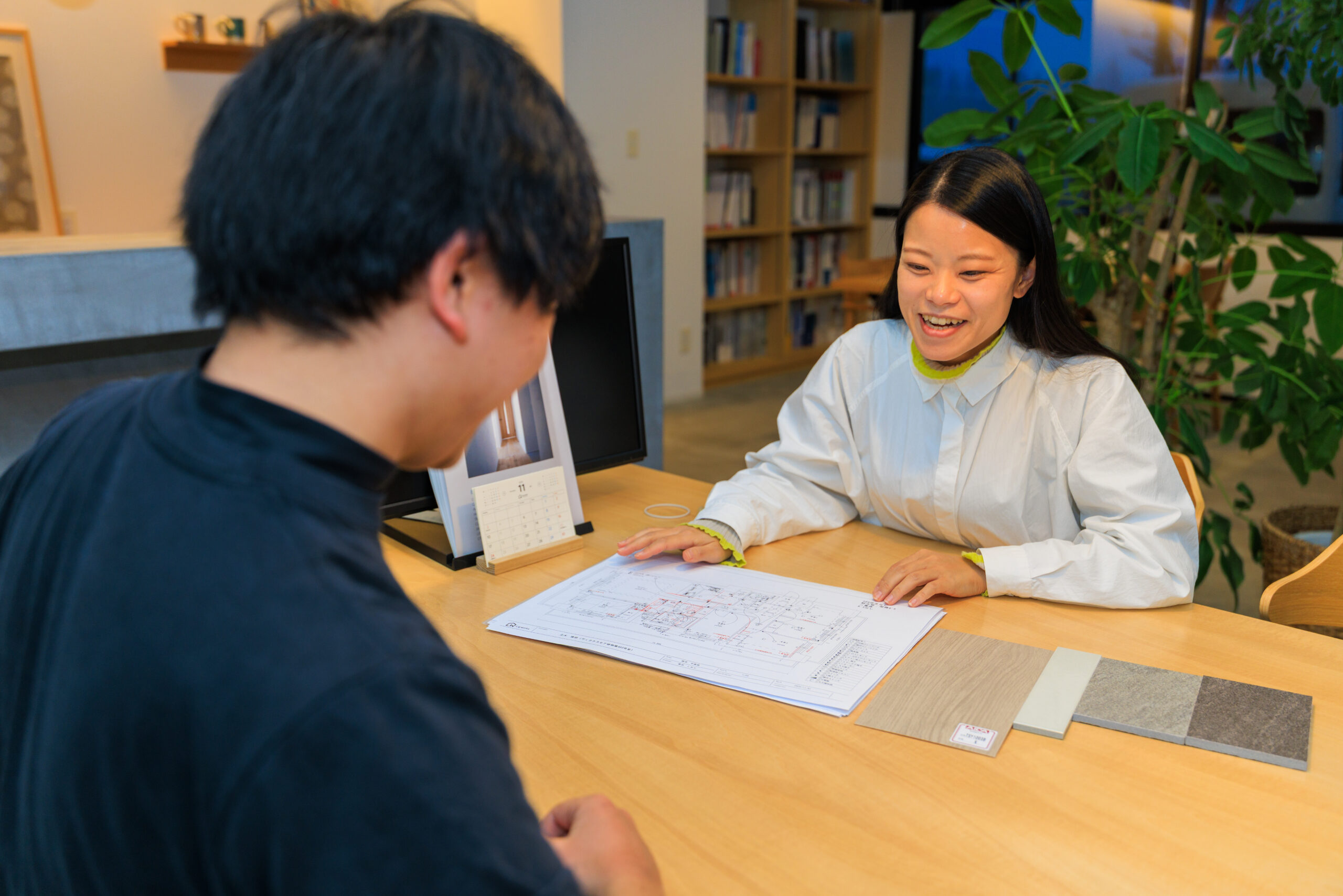 はじめてご相談に来てくださるお客様の商談を行います。暮らしのイメージを丁寧に聞き取り、物件探しやリノベーションの流れのご説明・ご提案を行います。時には、市内に2箇所あるモデルルームをご案内し実際の施工をイメージしてもらうこともあります。