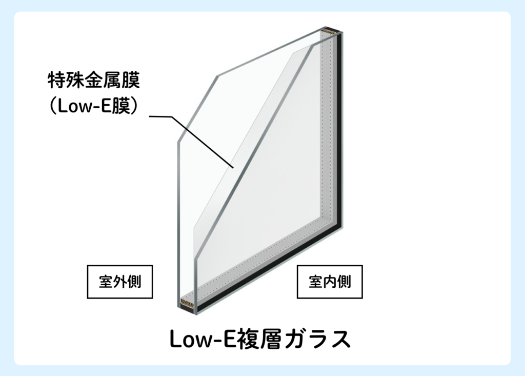 Low-E複層ガラスとは、表面に特殊な金属のコーティング膜を施すことで通常のガラスよりも高い断熱性能を有しているガラスです。冬の寒さだけではなく、夏の日差しによる室内への熱の侵入も防いでくれます。ガラスとガラスの間にアルゴンガスを封入したタイプだとより熱伝導率が下がり、断熱性能が上がります。