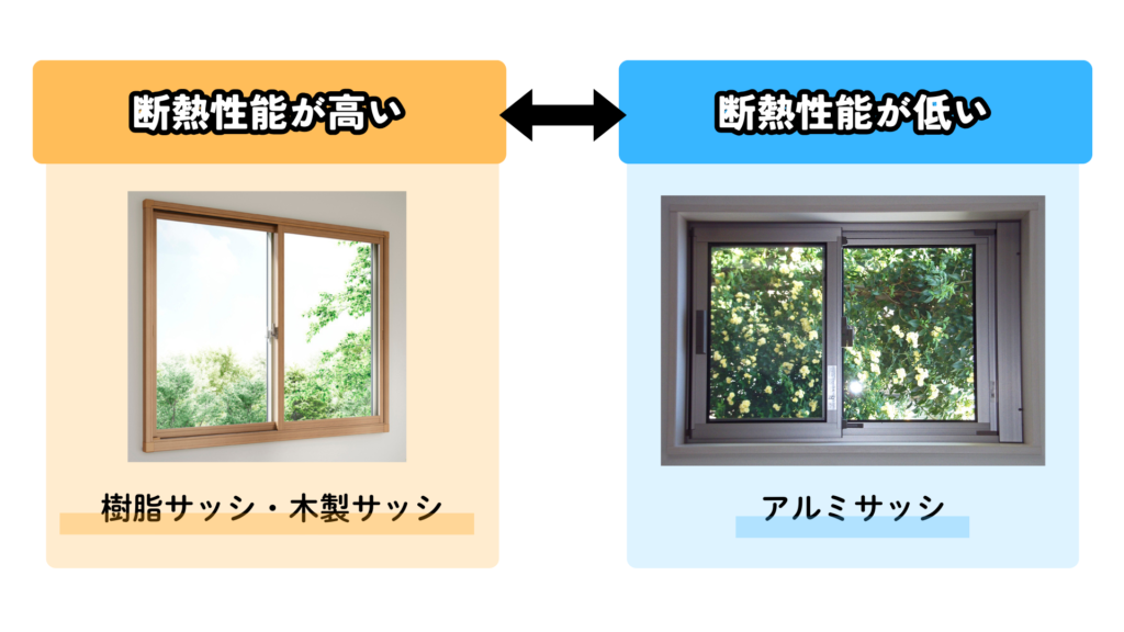 サッシ(窓枠)の素材も重要です。樹脂や木製のサッシは熱伝導率が低く、冷たい空気を伝えにくいため断熱性能が高いです。